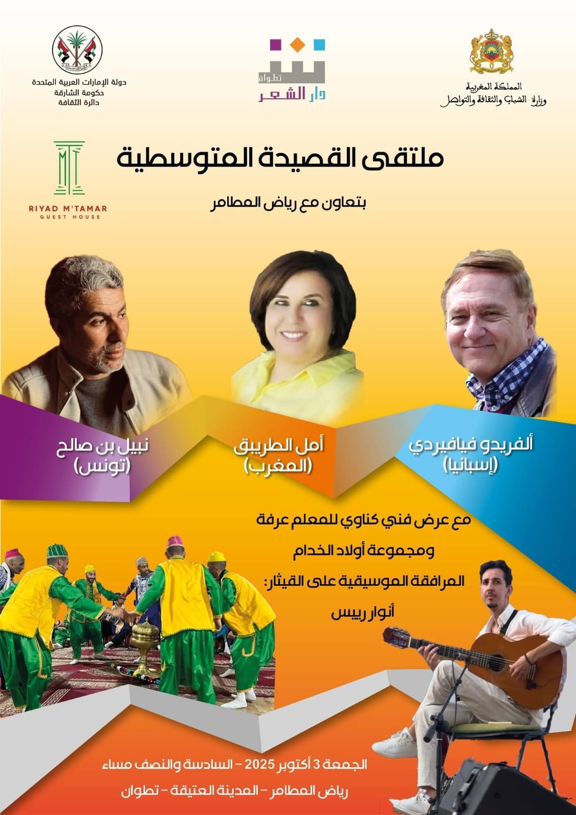 ويمشارك في هذا الملتقى، الذي ينظم بتعاون مع مؤسسة “رياض المطامر”، الشاعر ألفريدو فيافيردي من إسبانيا والشاعرة أمل الطريبق من المغرب والشاعر نبيل بن صالح من تونس. ويحيي المعلم عرفة الكناوي الحفل الفني لهذا الملتقى، رفقة مجموعة “أولاد الخدام”، في عرض موسيقي وكناوي جديد، بينما يرافق عازف القيثار يوسف رييس شعراء الأمسية، على إيقاعات الفلامنكو والموسيقى الكلاسيكية.