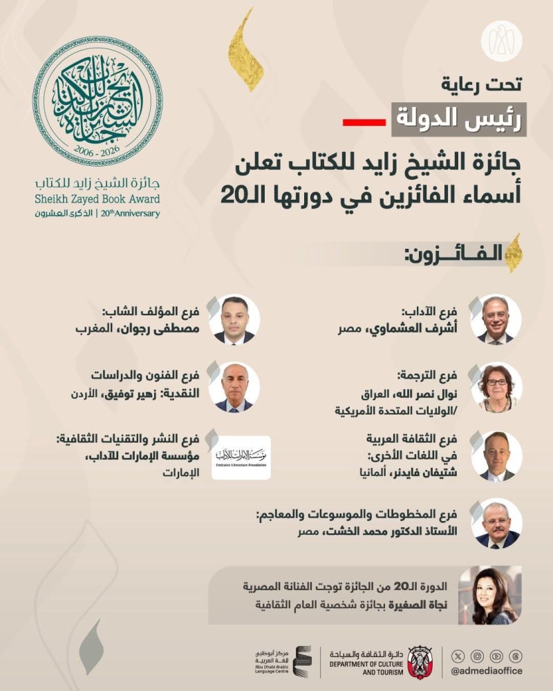 وتواصل جائزة الشيخ زايد للكتاب في دورتها العشرين توسيع امتدادها الجغرافي وتعزيز حضورها الدولي، إذ تضم قائمة الفائزين هذا العام ثمانية فائزين ينتمون إلى بيئات ثقافية متعددة ألمانيا والعراق ومصر والأردن والمغرب، ودولة الإمارات، بما يجسد رسالتها الجامعة للمبدعين والباحثين من ثقافات متعددة، ويؤكد دورها في مد جسور الحوار المعرفي تحت مظلة ثقافية واحدة، تنفتح على العالم وتستقطب طاقاته الخلاقة.